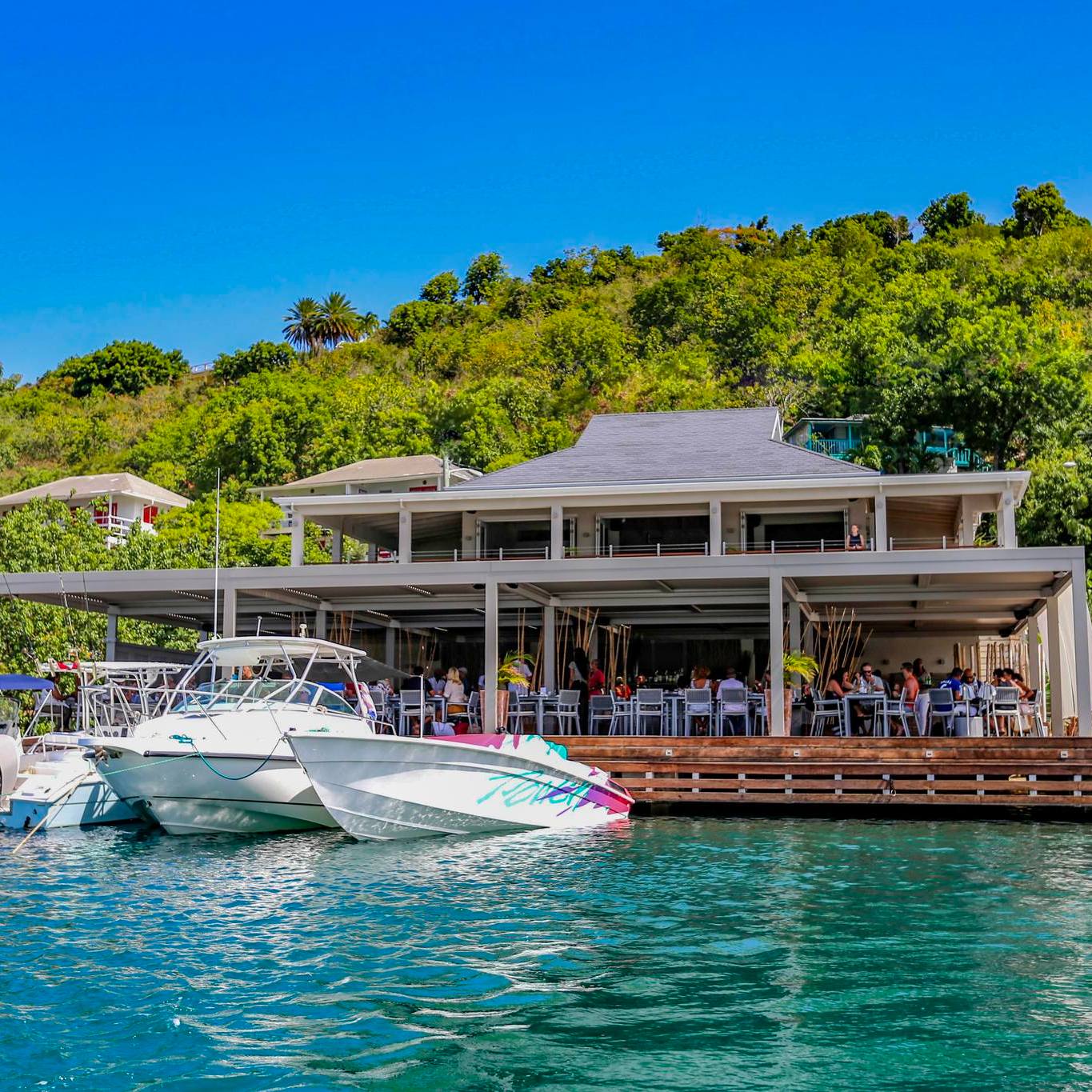 Though the restaurant’s stylish setting suggests fine-dining and dress codes, South Point is the definition of island chic – understated and easy-going. Both the lounge and restaurant welcome non-hotel guests to enjoy the casual, cafe-style vibes. As a testament to this, the restaurant deck, which is suspended over water, is easily accessible by water and equipped for tying up dinghies and paddleboards.